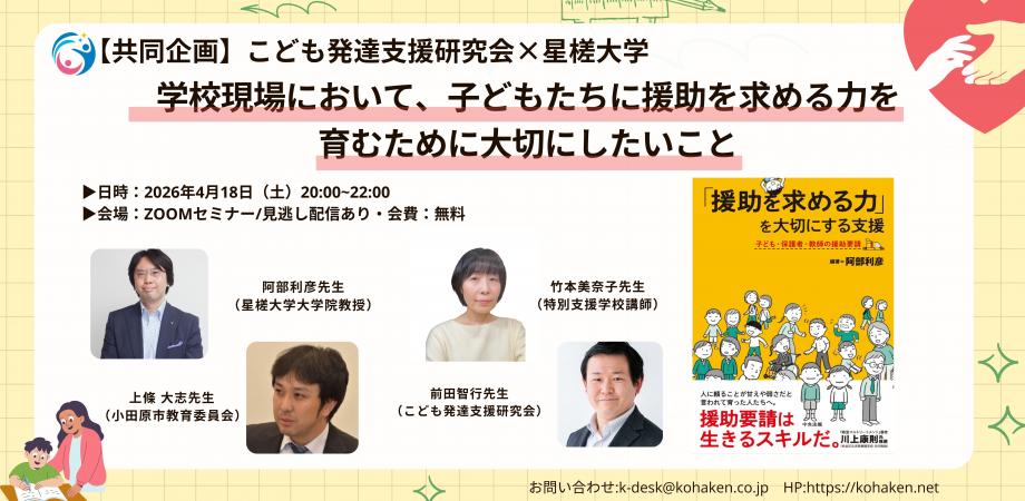 2025年に開催し、2,000名を超える申し込みをいただいた「援助要請スキル」のセミナー。2026年はその熱量をさらに広げ、より現場に即した「小学校での実践」をメイン... powered by Peatix : More than a ticket.