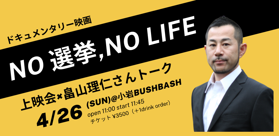 ドキュメンタリー映画『NO 選挙,NO LIFE』の上映会を開催します。上映後には畠山理仁さんのトーク&質問タイムがあります!   取材歴25年。平均睡眠時間2時... powered by Peatix : More than a ticket.
