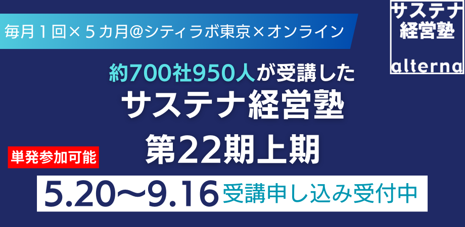 オルタナ/オルタナ総研は、5月20日に企業向けサステナ研修・セミナーとして、「サステナ経営塾」第22期を開講します。本講座では、SDGs、ESG、CSRといった「サステナ領域」の基... powered by Peatix : More than a ticket.