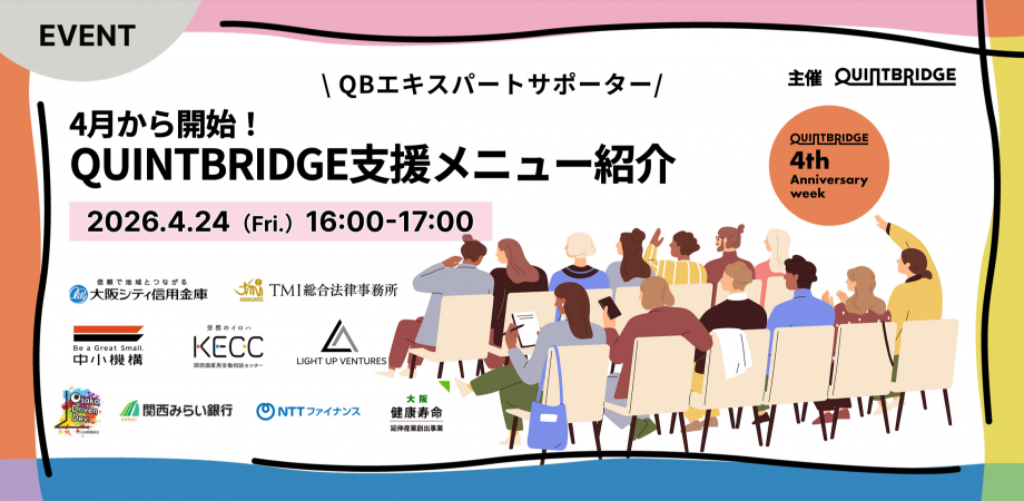 QUINTBRIDGE支援メニューのご紹介! 4月からQUINTBRIDGEで提供を開始する支援メニューを一度に知ることができる紹介イベントを開催します!創業・法律・技術・事業創業... powered by Peatix : More than a ticket.
