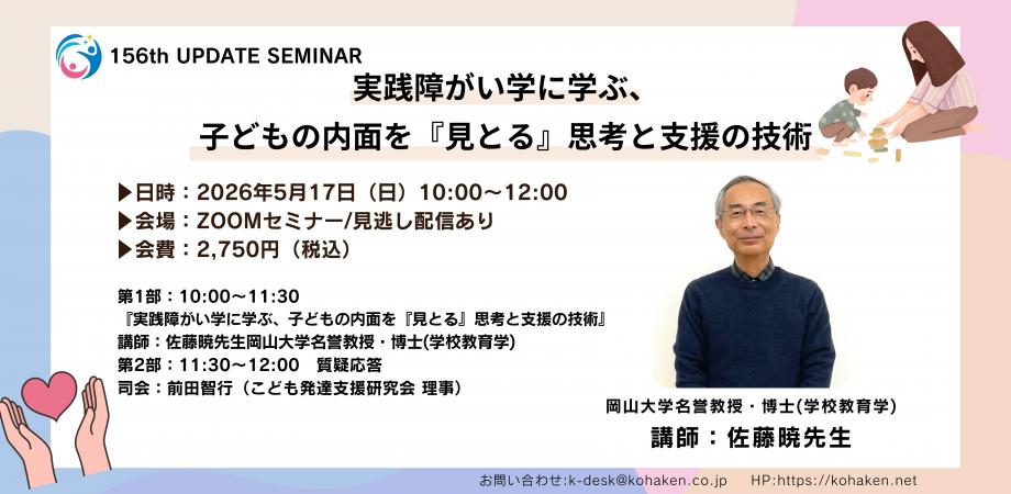 学校現場で多様な課題を抱える子が増える中、支援の手法だけでなく「支援者としての在り方」に迷う方が増えています。本セミナーでは、岡山大学名誉教授の佐藤曉先生をお招きし、先生が提唱さ... powered by Peatix : More than a ticket.
