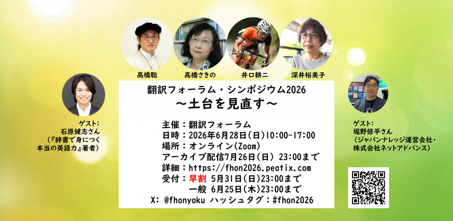 翻訳の将来が見通しづらい昨今。だからこそ今わたしたちは、翻訳の土台を再確認しようと思います。 わたしたちにとって翻訳の土台はなんといってもその楽しさ。自分の意志で翻訳をしている方も... powered by Peatix : More than a ticket.