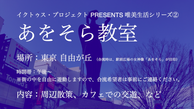 1〜2ヶ月に1回、自由が丘の街を遊動します。時間帯は、午後の予定です。