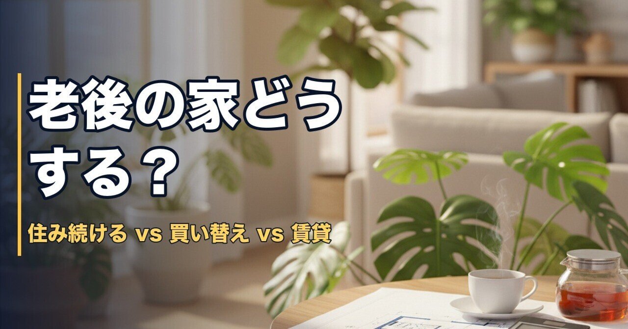 「この家、老後も住み続けられる?」ふと感じた不安 子どもが独立して夫婦二人になったとき、ふと思ったんです。 4LDKの一軒家、広すぎないか?と。 階段の上り下りは今は平気でも、70代・80代になったらどうだろう。 固定資産税は毎年約15万円。 修繕費も築20年を超えてどんどんかさんでいく。 「このまま住み続ける」以外の選択肢を、一度ちゃんと考えてみることにしました。 選択肢は3つ。数字で比較し