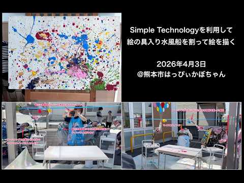 重度の肢体不自由がある施設利用者が、アクセシビリティスイッチで制御するアームを使って絵の具入り水風船を割り、ドリッピング技法でアート作品を制作する活動の記録だ。
