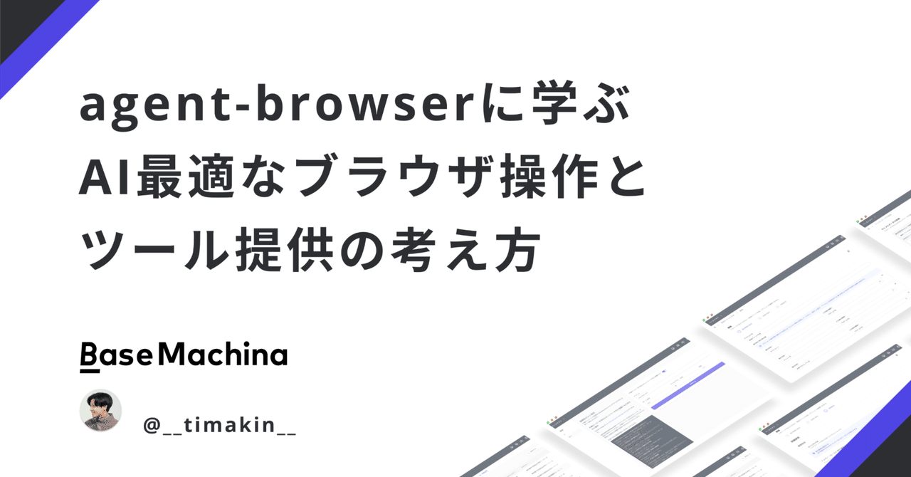 皆さまこんにちは、株式会社ベースマキナの代表取締役社長を務めております高橋(@__timakin__)です。 先日vercel-labs/agent-browserがリリースされました。「トークン消費93%削減」という謳い文句を見て、どうやってそれを実現しているのか気になったので中身を読んでみました。パッと見はPlaywrightのラッパーに見えるのですが、実際にはAIエージェント向けの入出力設