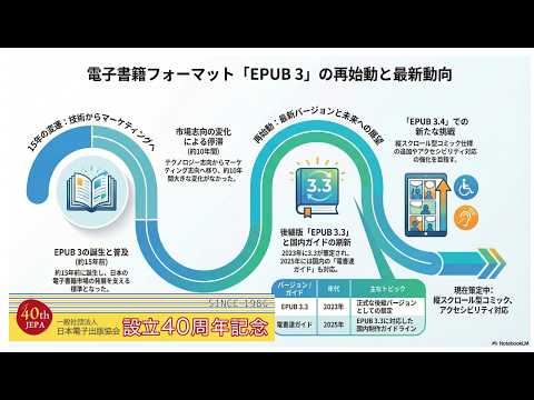 電子書籍フォーマットEPUB 3の歴史的変遷から、EPUB 3.4とアクセシビリティ最新動向までを専門家が体系的に解説している。